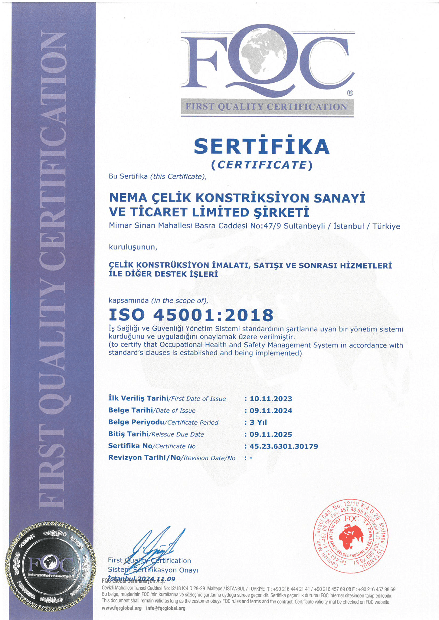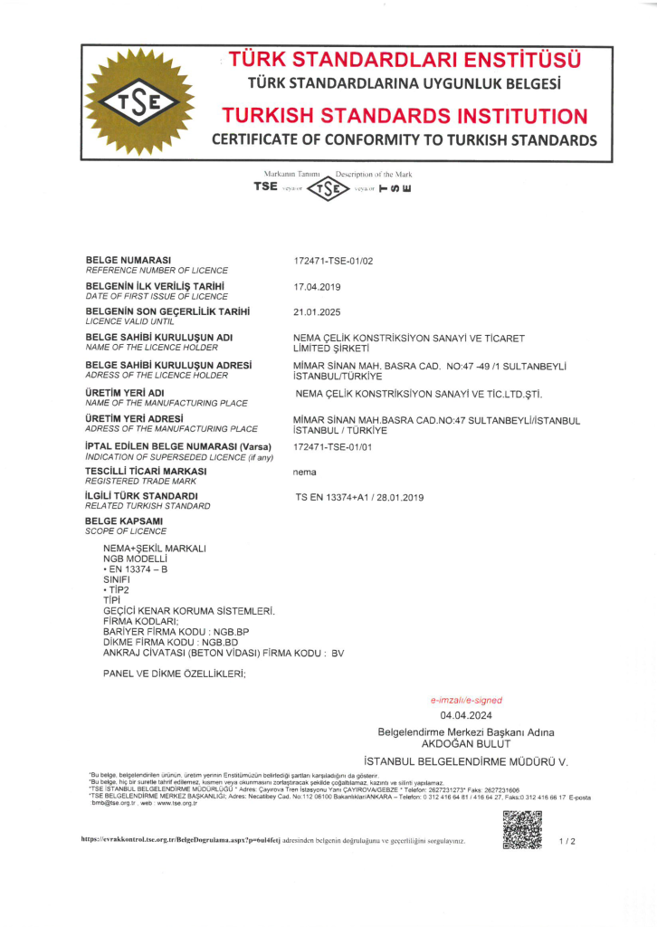 Document Name Lorem ipsum dolor sit amet, consectetur adipiscing elit. Ut elit tellus, luctus nec ullamcorper mattis, pulvinar dapibus leo. Issuing Authority TÜV Rheinland Expiration Date 2025 Scope All production processes Certificate Number 9.23.6301.10376.U Document Name TS EN 13374-B Edge Safety Barrier Issuing Authority TSE Expiration Date 2026 Scope Edge safety barrier system Certificate Number 172471-TSE-01/02 Document Name ISO 45001:2018 Occupational Health and Safety Issuing Authority Bureau Veritas Expiration Date 2025 Scope Occupational health and safety management Certificate Number 45.23.6301.30179